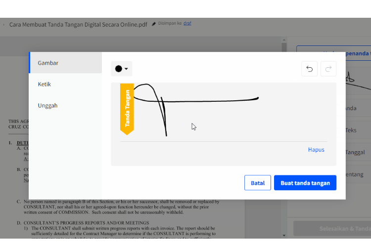Cara Membuat Tanda Tangan Digital, Mudah dan Cepat 30/07/2024 Ilustrasi. Foto : privy.id MEDIAKAMU.com - Sebagaimana yang cukup umum diketahui, tanda tangan kini tidak hanya berbentuk fisik yang dibubuhkan pada dokumen cetak. Akan tetapi, beberapa keperluan administrasi, seperti surat, laporan, dan lainnya, bisa ditandatangani dengan tanda tangan digital. Untuk membuat tanda tangan digital, ada banyak cara yang bisa dilakukan. Pengguna bisa membuat tanda tangan digital dengan memakai aplikasi seperti Microsoft Word. Selain itu, pengguna juga bisa membuat tanda tangan digital tanpa aplikasi. Pembuatan tanda tangan digital tanpa aplikasi bakal memudahkan pengguna karena pengguna jadi tak perlu repot mengunduh dan menginstal aplikasi dulu. Lantaran bakal memudahkan, pengguna kiranya perlu mengetahui cara bikin tanda tangan digital tanpa aplikasi. Berikut cara bikin tanda tangan digital tanpa aplikasi: 1. Cara membuat tanda tangan digital tanpa aplikasi via SmallPDF Pengguna bisa membuat tanda tangan digital tanpa aplikasi melalui website SmallPDF. Di SmallPDF, pengguna bisa membuat dan membubuhkan langsung tanda tangan digital di dokumen PDF. Adapun caranya adalah sebagai berikut: Buka website ini www.smallpdf.com/id/tanda-tangan-pdf. Kemudian, klik menu “Pilih File” dan unggah file PDF yang hendak dibubuhkan tanda tangan digital. Setelah terunggah, klik opsi “Tambahkan tanda tangan” dan bakal muncul jendela pembuatan tanda tangan digital. Di jendela itu, silakan buat tanda tangan. Jika sudah dibuat, seret tanda tangan tersebut ke dokumen. Terakhir, klik opsi “Selesaikan & Tanda Tangan” dan unduh dokumen yang tadi telah ditambahkan tanda tangan digital. Foto : small pdf 2. Cara membuat tanda tangan digital tanpa aplikasi via CreateMySignature Pengguna bisa juga membuat tanda tangan digital tanpa aplikasi melalui website CreateMySignature. Di website itu, pengguna dapat menggambar tanda tangannya sendiri untuk nanti dibubuhkan ke dokumen. Adapun caranya adalah sebagai berikut: Buka website ini www.createmysignature.com. Kemudian, pada kolom yang tersedia, silakan buat tanda tangan. Setelah itu, klik opsi “Download signature” dan gambar tanda tangan digital bakal bisa disimpan. Cukup mudah bukan cara membuat tanda tangan tanpa aplikasi? Melalui beberapa cara di atas, pengguna tak perlu bingung ketika diminta untuk membubuhkan tanda tangan digital di dokumen digital. Sumber : Dikutip berbagai sumber Share Post Share